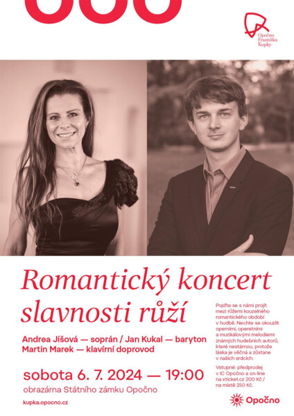 Pojďte se s námi projít mezi růžemi kouzelného romantického období v hudbě. Nechte se okouzlit operními, operetními a muzikálovými melodiemi známých hudebních autorů, které nestárnou, protože láska je věčná a zůstane v našich srdcích. Obsazení: Andrea Jíšová - soprán, Jan Kukal - baryton, Martin Marek - klavírní doprovod.